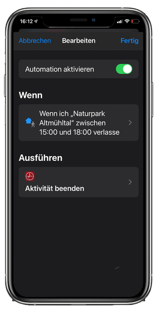 · Wenn ein Ort in einer festgelegten Zeit verlassen wird, dann Aktivität beenden